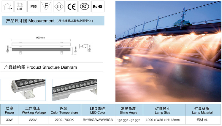 • LED洗墻燈,顧名思義,讓燈光象水一樣洗過墻面,主要也是用來做建筑裝飾照明之用,還有用來勾勒大型建筑的輪廓。由于LED具有節(jié)能、光效高、色彩豐富、壽命長等特點,所以在2013年其他光源的洗墻燈逐漸被LED洗墻燈代替。